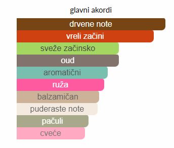 - Donje note: Sandalovina, Pačuli, Agar (Oud)