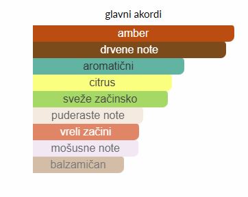 • Osnovne note: Mošus, Vanila, Drvene note