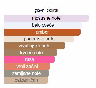 - Bazne note: Cibetka, Mošus, Mahovina, Amber, Sandalovo drvo, Pačuli, Kedar